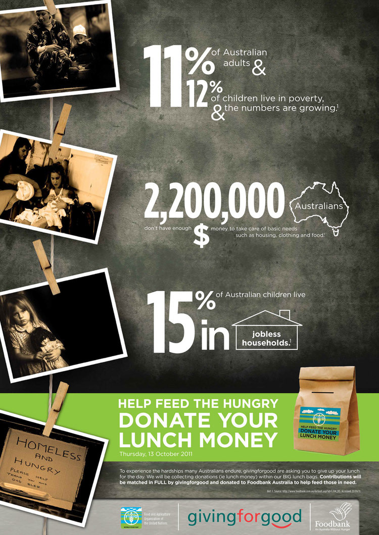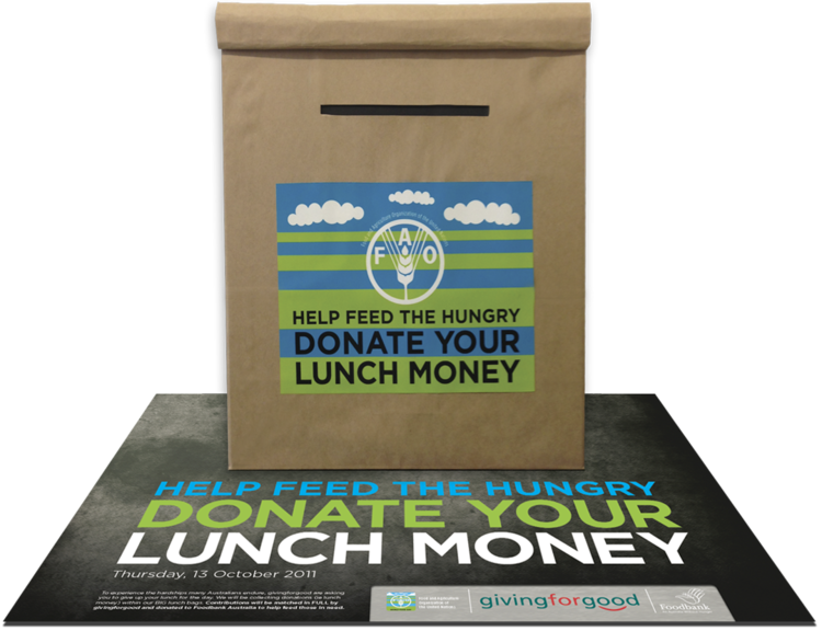 A giant lunch bag draws attention to this low-budget philanthropic campaign, and is the receptacle for contributions.